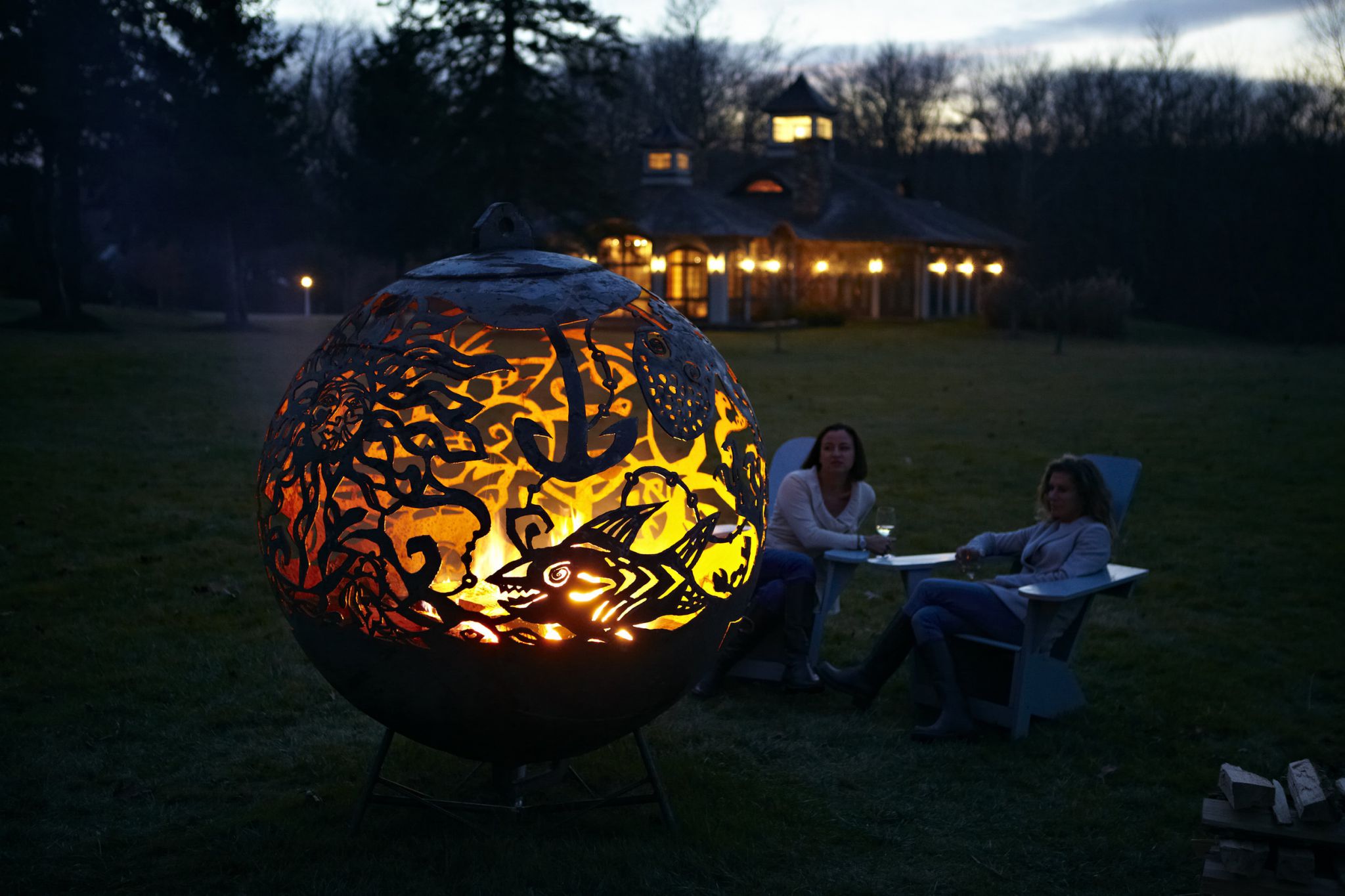 There are two Fireballs installed on the property. The more miniature 28-inch diameter sculpture greets guests on the upper terrace for intimate outdoor gatherings, and the commanding 58-inch diameter work punctuates one of Winvian Farm's signature meadows. Both are visible from the original 1775 Main house and Spa building, surrounded by Adirondack chairs where guests can enjoy aprés dinner aperitifs and afternoon hot chocolate.